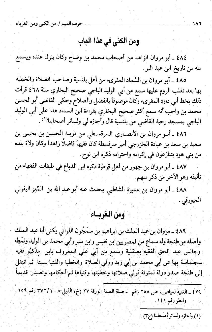487 - أَبُو مَرْوَان بن جهور من أَهْل قرطبة ذكره ابْن الدّباغ فِي طَبَقَات الْفُقَهَاء من تأليفه وَهُوَ الآخر من ذكر مِنْهُم