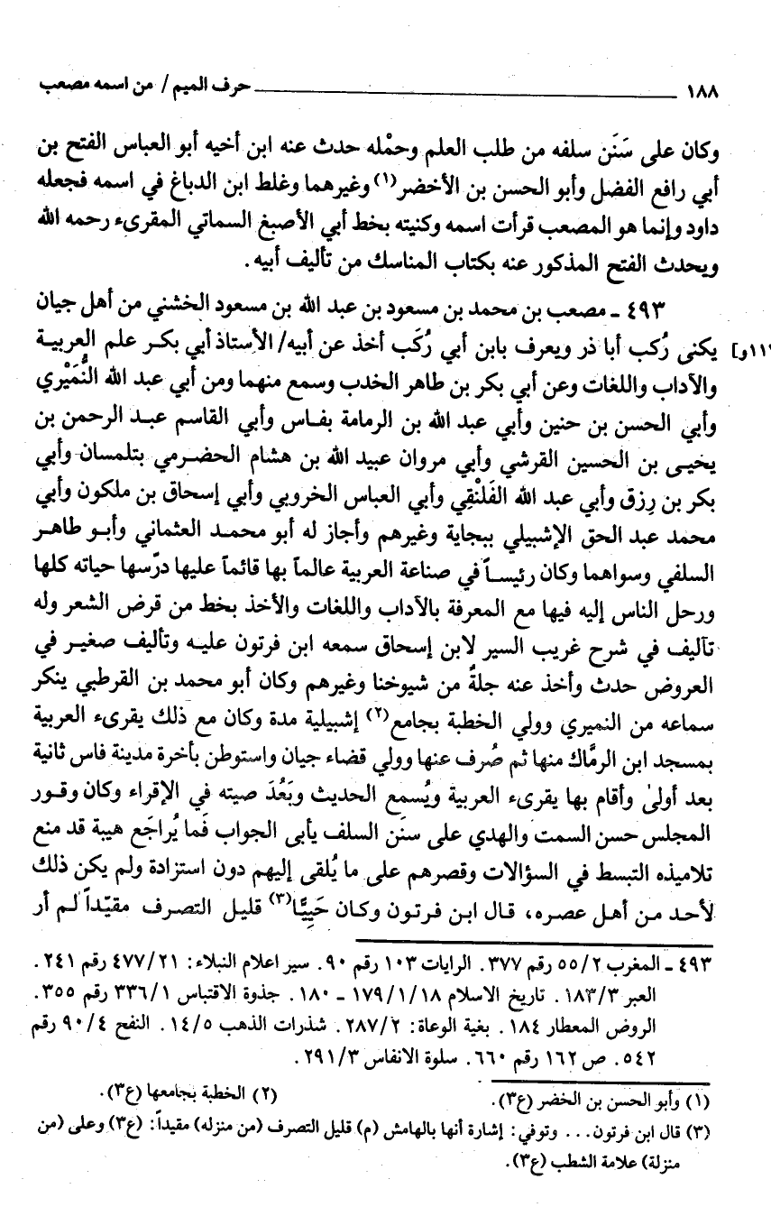 493 - مُصعب بن مُحَمَّد بن مَسْعُود بن عَبْد اللَّه بْن مَسْعُود الخُشَنِي من أهل جيان يكنى ركب أَبَا ذَر وَيعرف بِابْن أبي ركب أَخذ عَن أَبِيه الْأُسْتَاذ أبي بكر علم الْعَرَبيَّة والآداب واللغات وَعَن أبي بكر بن طَاهِر الخدب وَسمع مِنْهُمَا وَمن أبي عبد الله النميري وَأبي الْحسن بن حنين وَأبي عبد الله بن الرمامة بفاس وَأبي الْقَاسِم عبد الرَّحْمَن بن يحيى بن الْحُسَيْن الْقرشِي وَأبي مَرْوَان عبيد الله بن هِشَام الْحَضْرَمِيّ بتلمسان وَأبي بكر بن رزق وَأبي عبد الله الفلنقي وَأبي الْعَبَّاس الخروبي وَأبي إِسْحَاق بن ملكون وَأبي مُحَمَّد عبد الْحق الإشبيلي ببجاية وَغَيرهم وَأَجَازَ لَهُ أَبُو مُحَمَّد العثماني وَأَبُو طَاهِر السلَفِي وسواهما وَكَانَ رَئِيسا فِي صناعَة الْعَرَبيَّة عَالما بهَا قَائِما عَلَيْهَا درسها حَيَاته كلهَا ورحل النَّاس إِلَيْهِ فِيهَا مَعَ الْمعرفَة بالآداب واللغات وَالْأَخْذ بِخَط من قرض الشّعْر وَله تأليف فِي شرح غَرِيب السّير لِابْنِ إِسْحَاق سَمعه ابْن فرتون عَلَيْهِ وتأليف صَغِير فِي الْعرُوض حدث واخذ عَنهُ جلة من شُيُوخنَا وَغَيرهم وَكَانَ أَبُو مُحَمَّد بن الْقُرْطُبِيّ يُنكر سَمَاعه من النميري وَولي الْخطْبَة بِجَامِع إشبيلية مُدَّة وَكَانَ مَعَ ذَلِك يقرئ الْعَرَبيَّة بِمَسْجِد ابْن الرماك مِنْهَا ثمَّ صرف عَنْهَا وَولي قَضَاء جيان واستوطن بِأخرَة مَدِينَة فاس ثَانِيَة بعد أولي وَأقَام بهَا يقرئ الْعَرَبيَّة وَيسمع الحَدِيث وَبعد صيته فِي الإقراء وَكَانَ وقور الْمجْلس حسن السمت وَالْهدى على سنَن السّلف يَأْبَى الْجَواب فَمَا يُرَاجع هَيْبَة قد منع تلاميذه التبسط فِي السؤالات وقصرهم على مَا يلقِي إِلَيْهِم دون استزاده وَلم يكن ذَلِك لأحد من أهل عصره قَالَ ابْن فرتون وَكَانَ حييا قَلِيل التَّصَرُّف مُقَيّدا لم أر