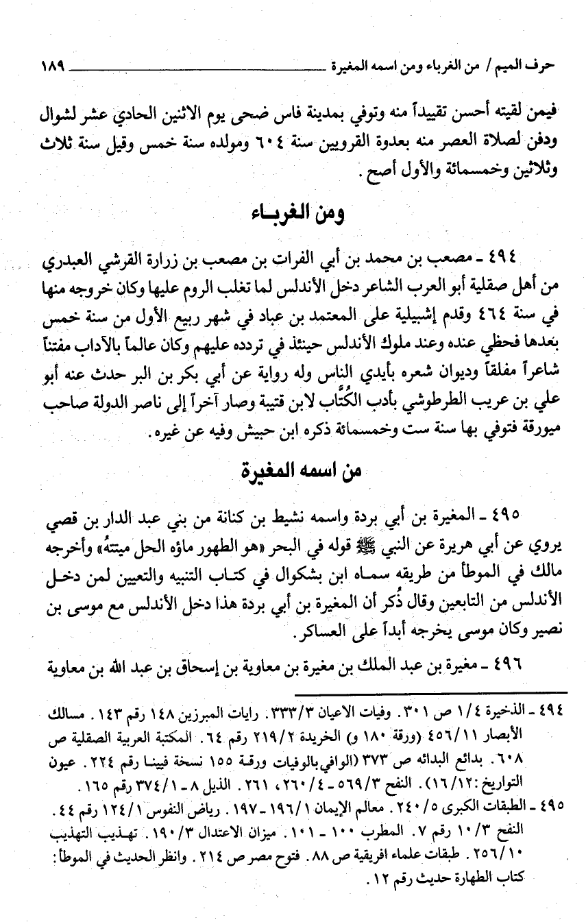495 - الْمُغيرَة بن أبي بردة واسْمه نشيط بن كنَانَة من بني عبد الدَّار بن قصي يروي عَن أبي هُرَيْرَة عَن النَّبِي صلى الله عَلَيْهِ وَسلم قَوْله فِي الْبَحْر هُوَ الطّهُور مَاؤُهُ الْحل ميتَته وَأخرجه مَالك فِي الْمُوَطَّأ من طَرِيقه سَمَّاهُ ابْن بشكوال فِي كتاب التَّنْبِيه وَالتَّعْيِين لمن دَخَلَ الأندلس من التَّابِعين وَقَالَ ذكر أَن الْمُغيرَة بن أبي بردة هَذَا دخل الأندلس مَعَ مُوسَى بن نصير وَكَانَ مُوسَى يُخرجهُ أبدا على العساكر