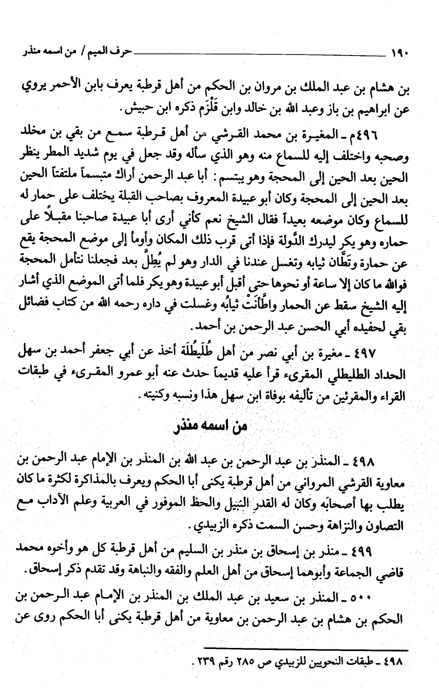 498 - الْمُنْذر بن عَبْد الرَّحْمَن بْن عَبْد اللَّه بن الْمُنْذر بن الْأَمَام عبد الرَّحْمَن بْن مُعَاوِيَة الْقُرَشِيّ المرواني من أَهْلَ قرطبة يكنى أَبَا الحكم وَيعرف بالمذاكرة لِكَثْرَة مَا كَانَ يطْلب بهَا أَصْحَابه وَكَانَ لَهُ الْقدر النَّبِيل والحظ الموفور فِي الْعَرَبيَّة وَعلم الْآدَاب مَعَ التصاون والنزاهة وَحسن السمت ذكره الزبيدِيّ