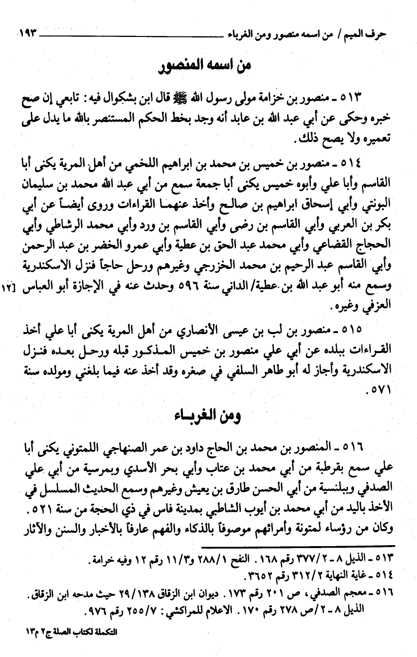 516 - الْمَنْصُور بن مُحَمَّد بن الْحَاج دَاوُد بن عمر الصنهاجي اللمتوني يكنى أَبَا عَليّ سمع بقرطبة من أبي مُحَمَّد بن عتاب وَأبي بَحر الْأَسدي وبمرسية من أبي عَليّ الصَّدَفِي وببلنسية من أبي الْحسن طَارق بن يعِيش وَغَيرهم وَسمع الحَدِيث المسلسل فِي الْأَخْذ بِالْيَدِ من أبي مُحَمَّد بن أَيُّوب الشاطبي بِمَدِينَة فاس فِي ذِي الْحجَّة من سنة 521 وَكَانَ من رُؤَسَاء لمتونة وأمرائهم مَوْصُوفا بالذكاء والفهم عَارِفًا بالأخبار وَالسّنَن والْآثَار