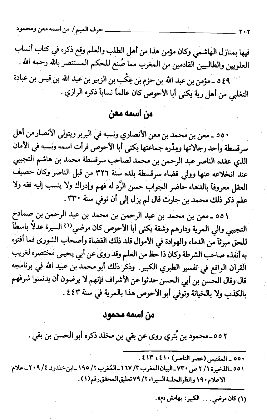 551 - معن بْن مُحَمَّد بْن عبد الرَّحْمَن بن مُحَمَّد بن عَبْد الرَّحْمَن بْن صمادح التجِيبِي وَالِي المرية ودارهم وشقة يكنى أَبَا الْأَحْوَص كَانَ مرضِي السِّيرَة عدلا باسطًا للحق مبرئًا من الدِّمَاء والهوادة فِي الْأَمْوَال قلد ذَلِكَ الْقُضَاة وَأَصْحَاب الشورى فَمَا أفتوه بِهِ أنفذه صَاحب الشرطة وَكَانَ ذَا حَظّ من الْعلم وَقَدْ روى عنْ أَبِي يَحيى مُخْتَصره لغريب الْقُرْآن الْوَاقِع فِي تَفْسِير الطَّبَرِيّ الْكَبِير وَذكر ذَلِكَ أَبُو مُحَمَّد بْن عُبَيْد اللَّه فِي برنامجه قَالَ وَقَالَ الْحَسَن بْن أبي الْحَسَن حدثوا عَنِ الإشراف فَإِنَّهُم لَا يرضون أَن يدنسوا شرفهم بِالْكَذِبِ وَلَا بالخيانة وَتُوفِّي أَبُو الْأَحْوَص هَذَا بالمرية فِي سنة 443