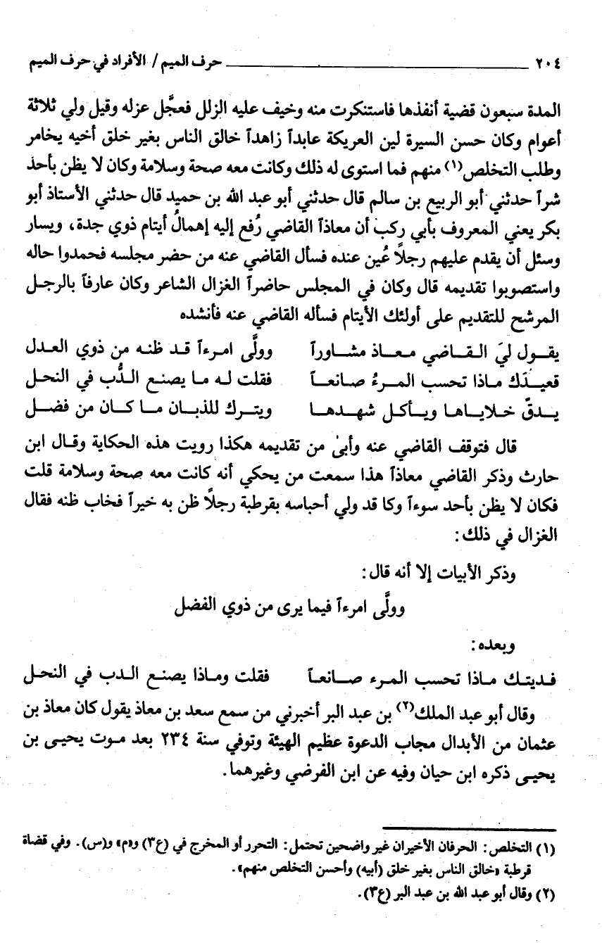 قَالَ فتوقف القَاضِي عَنْهُ وأبى من تَقْدِيمه هَكَذَا رويت هَذِهِ الْحِكَايَة وَقَالَ ابْنُ حَارِث وَذكر القَاضِي معَاذًا هَذَا سَمِعْتُ من يَحكي أَنَّهُ كَانَت مَعَه صِحَة وسلامة قلت فَكَانَ لَا يظنّ بِأحد سوءا وَكَانَ قَدْ ولي أحباسه بقرطبة رجلا ظن بِهِ خيرا فخاب ظَنّه فَقَالَ الغزال فِي ذَلِكَ