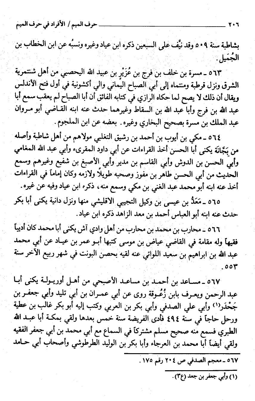 563 - مَسَرَّة بْن خلف بْن فرج بْن عُزَيْرٍ بن عُبَيْد الله الْيحصبِي من أهل شنتمرية الشرق وَنزل قرطبة ومنتماه إِلَى أَبِي الصَّباح الْيَمَانِيّ وَالِي أكشونية فِي أول فتح الأندلس وَيُقَال أَن ذَلِك لَا يَصح لما حَكَاهُ الرَّازِيّ فِي كِتَابه الْفَائِق أَن أَبَا الصَّباح لم يعقب سَمِعَ أَبَا عَبْد اللَّه بْن فرج وَأَبا عَبْد اللَّه بْن السقاط وَغَيرهمَا حدث عَنْهُ ابْنه القَاضِي أَبُو مَرْوَان عَبْد الْملك بْن مَسَرَّة بِصَحِيح الْبُخَارِيّ وَغَيره بعضه عنِ ابْنِ الملجوم