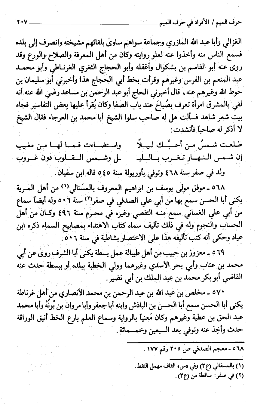 568 - موفق مولى يُوْسٌف بْن إِبْرَاهِيم الْمَعْرُوف بالمسَنالي من أهل المرية يكنى أَبَا الْحَسَن سَمِعَ بهَا من أَبِي عَلَى الصَّدَفِي فِي صفر سنة 506 وَله أَيْضا سَماع من أبي عَلِيّ الغساني سَمِعَ مِنْهُ التَّقَصِّي وَغَيره فِي محرم سنة 496 وَكَانَ من أهل الْحساب والنجوم وَله فِي ذَلِكَ تأليف سَمَّاهُ كتاب الاهتداء بمصابيح السَّمَاء ذكره ابْنُ عياد وَحكى أَنَّهُ كتب تأليفه هَذَا عَلَى الِاخْتِصَار بشاطبة فِي سنة 506