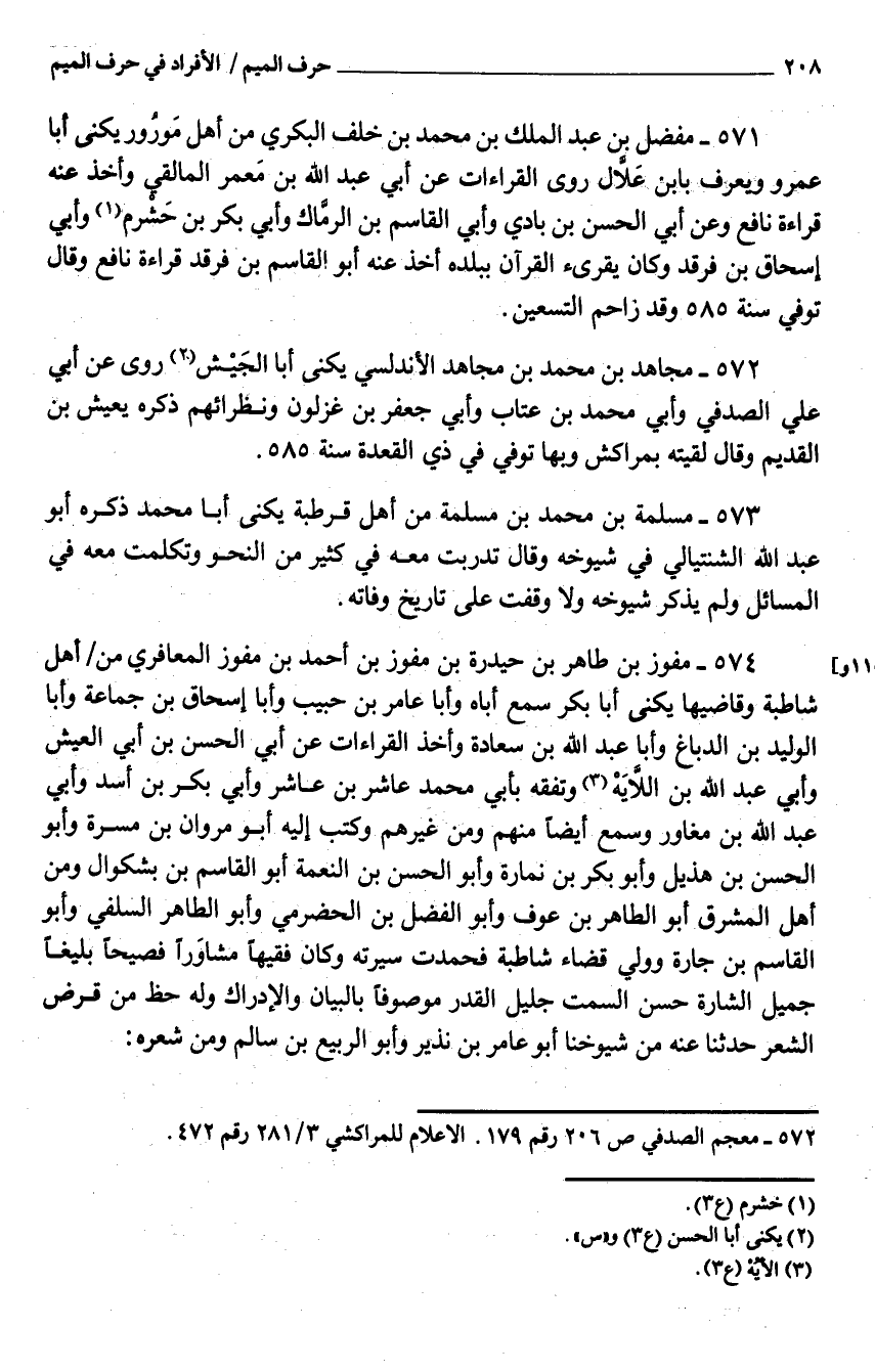 571 - مفضل بْن عَبْد الْملك بْن مُحَمَّد بْن خلف الْبكْرِيّ من أهل مورور يكنى أَبَا عَمْرو وَيعرف بِابْن علال روى الْقرَاءَات عنْ أَبِي عَبْد اللَّه بْن مَعمر المالقي وَأخذ عَنْهُ قِرَاءَة نَافِع وَعَن أَبِي الْحَسَن بْن بَادِي وَأبي الْقَاسِم بن الرماك وَأبي بكر بْن حَشْرم وَأبي إِسْحَاق بْن فرقد وَكَانَ يقرئ الْقُرْآن بِبَلَدِهِ أَخذ عَنْهُ أَبُو القَاسِم بْن فرقد قِرَاءَة نَافِع وَقَالَ توفّي سنة 585 وَقَدْ زاحم التسعين