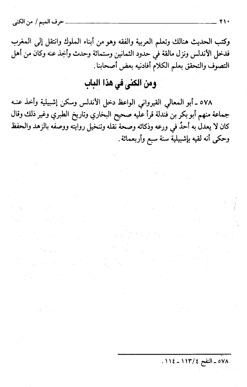 578 - أَبُو الْمَعَالِي القيرواني الْوَاعِظ دخل الأندلس وَسكن إشبيلية وَأخذ عَنْهُ جمَاعَة مِنْهُم أَبُو بَكْر بْن فندلة قَرَأَ عَلَيْهِ صَحِيح الْبُخَارِيّ وتاريخ الطَّبَرِيّ وَغير ذَلِكَ وَقَالَ كَانَ لَا يعدل بِهِ أحدٌ فِي ورعه وذكائه وَصِحَّة نَقله وتنخيل رِوَايَته وَوَصفه بالزهد وَالْحِفْظ وَحكى أَنَّهُ لقِيه بإشبيلية سنة سبع وَأَرْبَعمِائَة