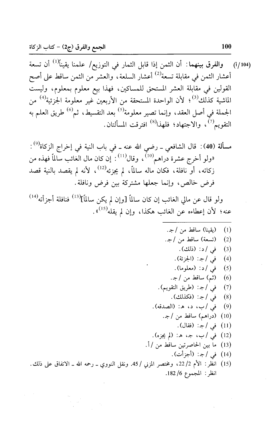 مسألة (٤٠): قال الشافعي - رضي الله عنه - في باب النية في إخراج الزكاة: "ولو أخرج عشرة دراهم، وقال: إن كان مال الغائب سالمًا فهذه من زكاته، أو نافلة فكان ماله سالمًا، لم يجزئه، لأنه لم يقصد بالنية قصد فرض خالص، وإنما جعلها مشتركة بين فرض ونافلة.