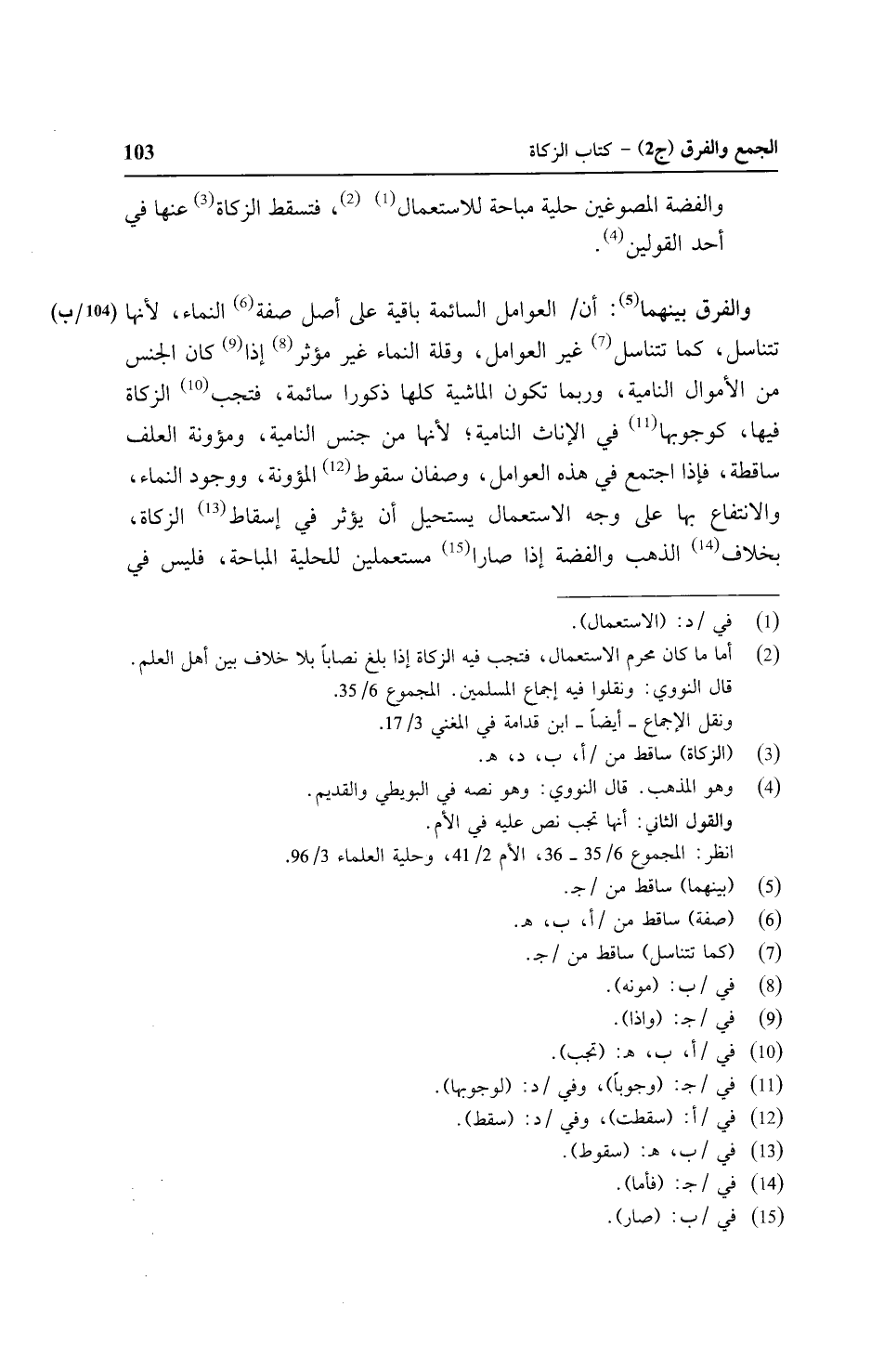 والفرق بينهما: أن/ (١٠٤ - ب) العوامل السائمة باقية على أصل صفة النماء، لأنها تتناسل، كما تتناسل غير العوامل، وقلة النماء غير مؤثر إذا كان الجنس من الأموال النامية، وربما تكون الماشية كلها ذكورًا سائمة، فتجب الزكاة فيها، كوجوبها في الإناث النامية؛ لأنها من جنس النامية، ومؤونة العلف ساقطة، فإذا اجتمع في هذه العوامل، وصفان سقوط المؤونة، ووجود النماء، والانتفاع بها على وجه الاستعمال يستحيل أن يؤثر في إسقاط الزكاة، بخلاف الذهب والفضة إذا صارا مستعملين للحلية المباحة، فليس في
