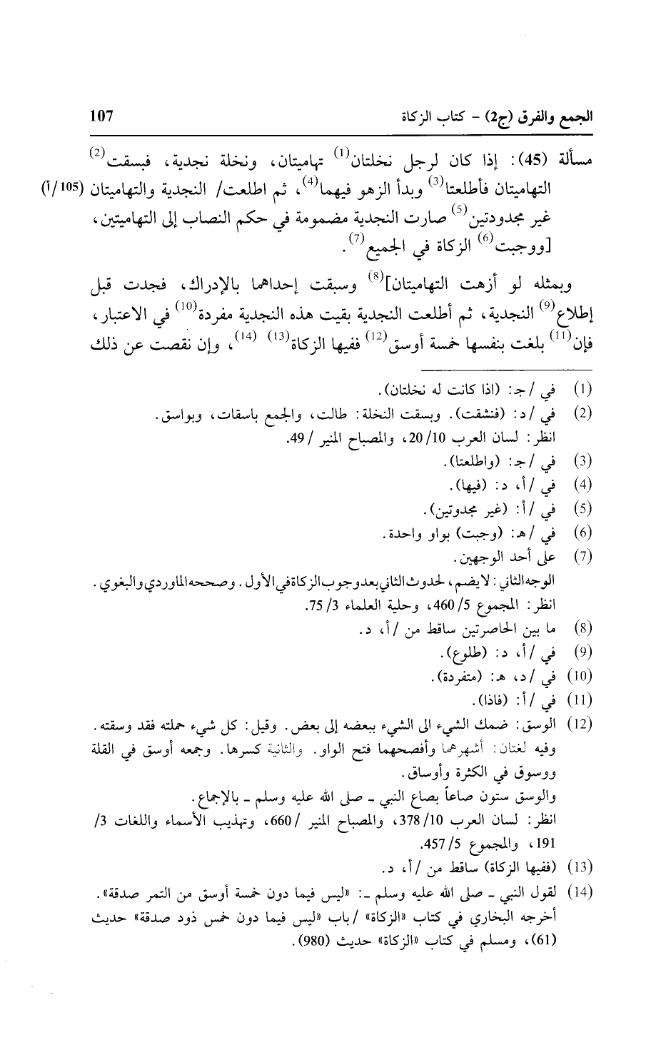 مسألة (٤٥): إذا كان لرجل نخلتان تهاميتان، ونخلة نجدية، فبسقت التهاميتان فأطلعتا وبدأ الزهو فيهما، ثم اطلعت/ (١٠٥ - ب) النجدية والتهاميتان غير مجدودتين صارت النجدية مضمومة في حكم النصاب إلى التهاميتين، [ووجبت الزكاة في الجميع.