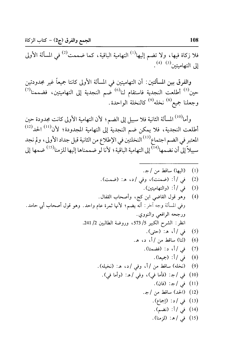 وأما المسألة الثانية فلا سبيل إلى الضم؛ لأن التهامية الأولى كانت مجددة حين أطلعت النجدية، فلا يمكن ضم النجدية إلى التهامية المجدودة؛ لأن الحد المعتبر في الضم اجتماع النخلتين في الإطلاع من الثانية قبل جداد الأولى، ولم نجد سبيلًا إلى أن نضمها إلى التهامية الباقية؛ لأنا لو ضممناها إليها للزمنا ضمها إلى