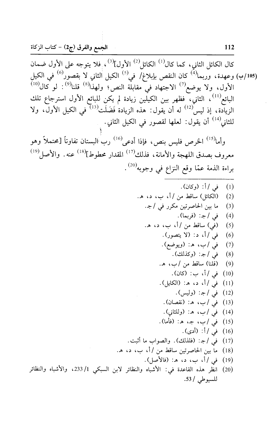 كال الكائل الثاني، كما كال الكائل الأول]، فلا يتوجه على الأول ضمان وعهدة، وربما كان النقص بإبلاغ/ (١٠٥ - ب) في الكيل الثاني لا بقصور في الكيل الأول، ولا يوضع الاجتهاد في مقابلة النص؛ ولهذا قلنا: لو كال البائع، الثاني، فظهر بين الكيلين زيادة لم يكن للبائع الأول استرجاع تلك الزيادة، إذ ليس له أن يقول: هذه الزيادة فضلت في الكيل الأول، ولا للثاني أن يقول: لعلها لقصور في الكيل الثاني.