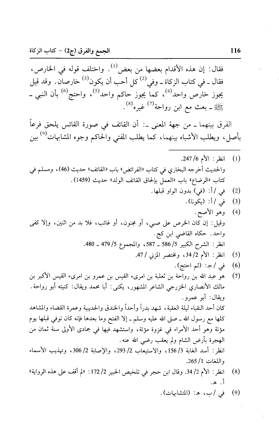 فقال: إن هذه الأقدام بعضها من بعض. واختلف قوله في الخارص، فقال - في كتاب الزكاة - وفي كل أحب أن يكون خارصان. وقد ميل يجوز خارص واحد، كما يجوز حاكم واحد، واحتج بأن النبي - صلى الله عليه وسلم - بعث مع ابن رواحة غيره.
