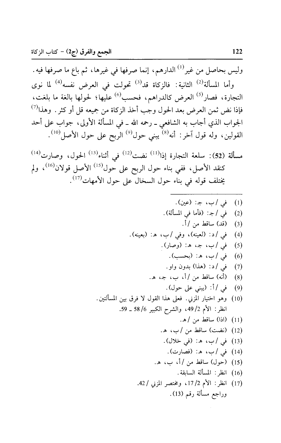 وأما المسألة الثانية: فالزكاة قد تحولت في العرض نفسه لما نوى التجارة، فصار العرض كالدراهم، فحسب عليها؛ لحولها بالغة ما بلغت، فإذا نض ثمن العرض بعد الحول وجب أخذ الزكاة من جميعه قل أو كثر. وهذا الجواب الذي أجاب به الشافعي - رحمه الله - في المسألة الأولى، جواب على أحد القولين، وله قول آخر: أنه يبني حول الربح على حول الأصل.