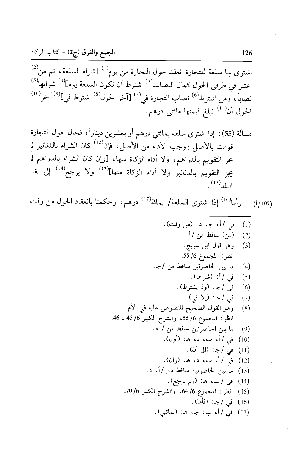 مسألة (٥٥): إذا اشترى سلعة بمائتي درهم أو بعشرين دينارًا، فحال حول التجارة قومت بالأصل ووجب الأداء من الأصل، فإن كان الشراء بالدنانير لم يجز التقويم بالدراهم، ولا أداء الزكاة منها، [وإن كان الشراء بالدراهم لم يجز التقويم بالدنانير ولا أداء الزكاة منها] ولا يرجع إلى نقد البلد.