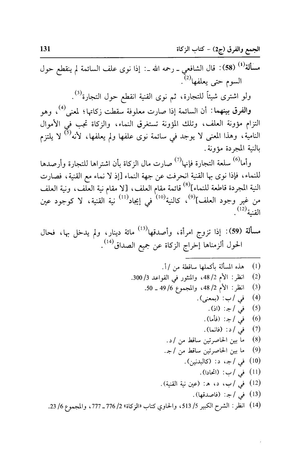 مسألة (٥٨): قال الشافعي - رحمه الله -: إذا نوى علف السائمة لم ينقطع حول السوم حتى يعلفها.