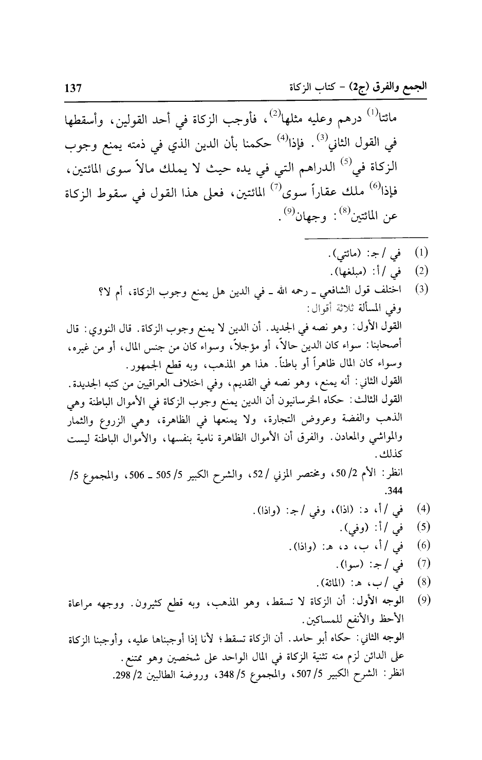 مائتا درهم وعليه مثلها، فأوجب الزكاة في أحد القولين، وأسقطها في القول الثاني. فإذا حكمنا بأن الدين الذي في ذمته يمنع وجوب الزكاة في الدراهم التي قد يده حيث لا يملك مالًا سوى المائتين، فإذا ملك عقارًا سوى المائتين، فعلى هذا القول في سقوط الزكاة عن المائتين: وجهان.