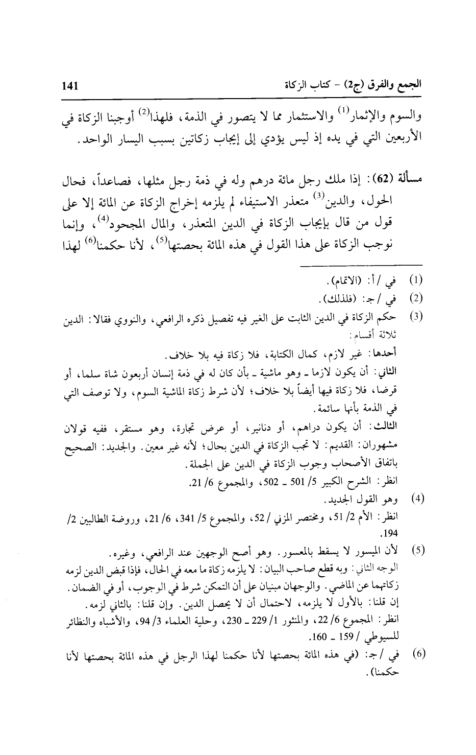 والسوم والإثمار والاستثمار مما لا يتصور في الذمة، فلهذا أوجبنا الزكاة في الأربعين التي في يده إذ ليس يؤدي إلى إيجاب زكاتين بسبب اليسار الواحد.