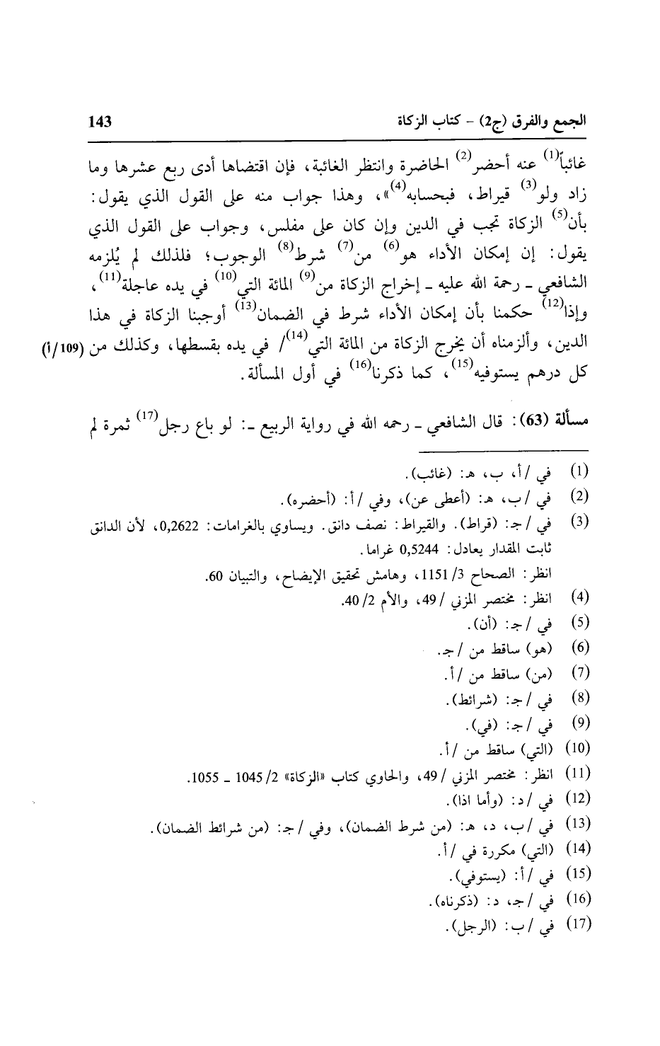 غائبًا عنه أحضر الحاضرة وانتظر الغائبة، فإن اقتضاها أدى ربع عشرها وما زاد ولو قيراط، فبحسابه"، وهذا جواب منه على القول الذي يقول: بأن الزكاة تجب في الدين وإن كان على مفلس، وجواب على القول الذي يقول: إن إمكان الأداء هو من شرط الوجوب؛ فلذلك لم يلزمه الشافعي -رحمة الله عليه- إخراج الزكاة من المائة التي في يده عاجلة، وإذا حكمنا بأن إمكان الأداء شرط في الضمان أوجبنا الزكاة في هذا الدين، وألزمناه أن يخرج الزكاة من المائة التي / (١٠٩ - ب) في يده بقسطها، وكذلك من كل درهم يستوفيه، كما ذكرنا في أول المسألة.