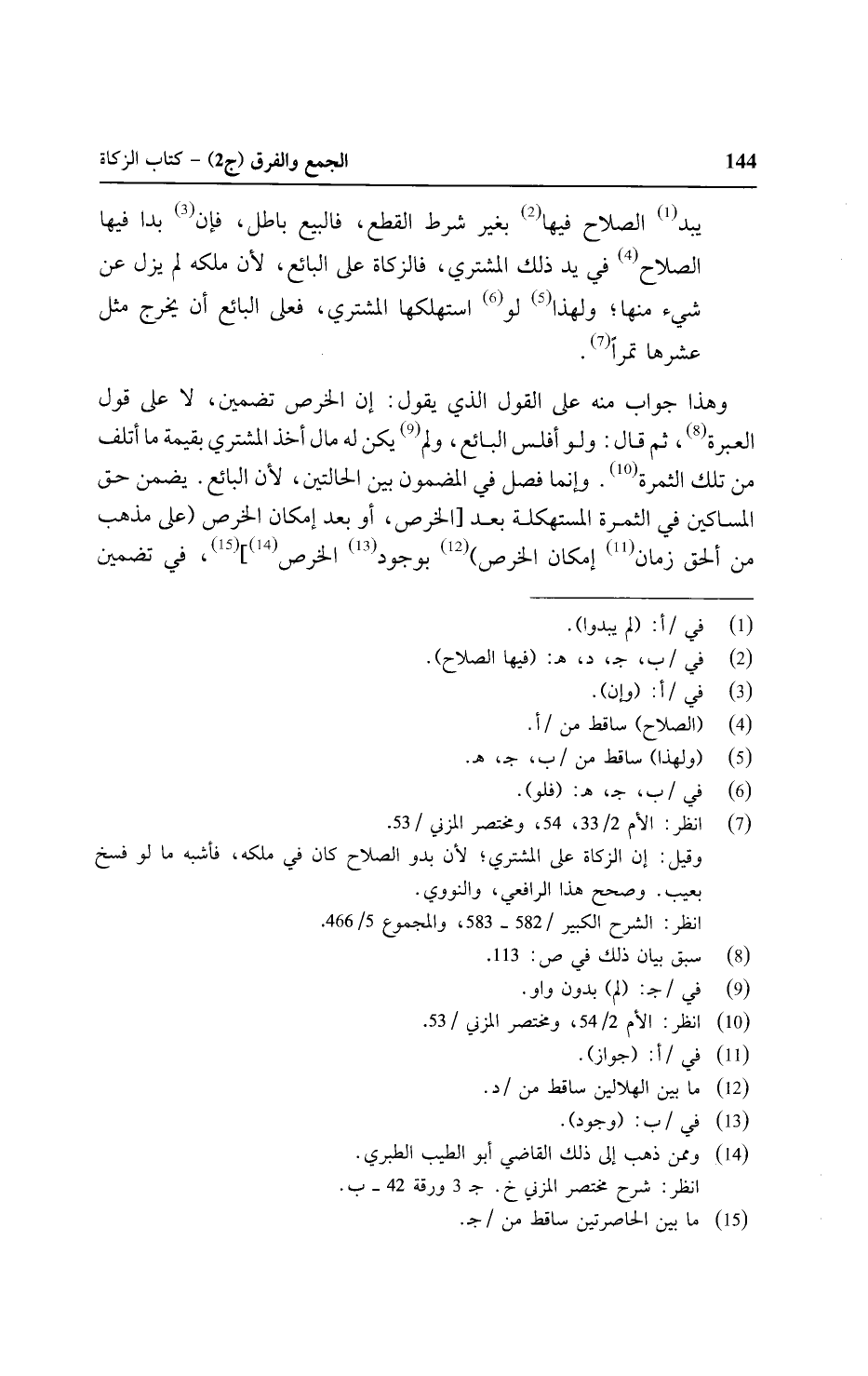 وهذا جواب منه على القول الذي يقول: إن الحرص تضمين، لا على قول العبرة، ثم قال: ولو أفلس البائع، ولم يكن له مال أخذ المشتري بقيمة ما أتلف من تلك الثمرة. وإنما فصل في المضمون بين الحالتين، لأن البائع. يضمن حق المساكين في الثمرة المستهلكة بعد] الخرص، أو بعد إمكان الخرص (على مذهب من ألحق زمان إمكان الخرص) بوجود الخرص [، في تضمين