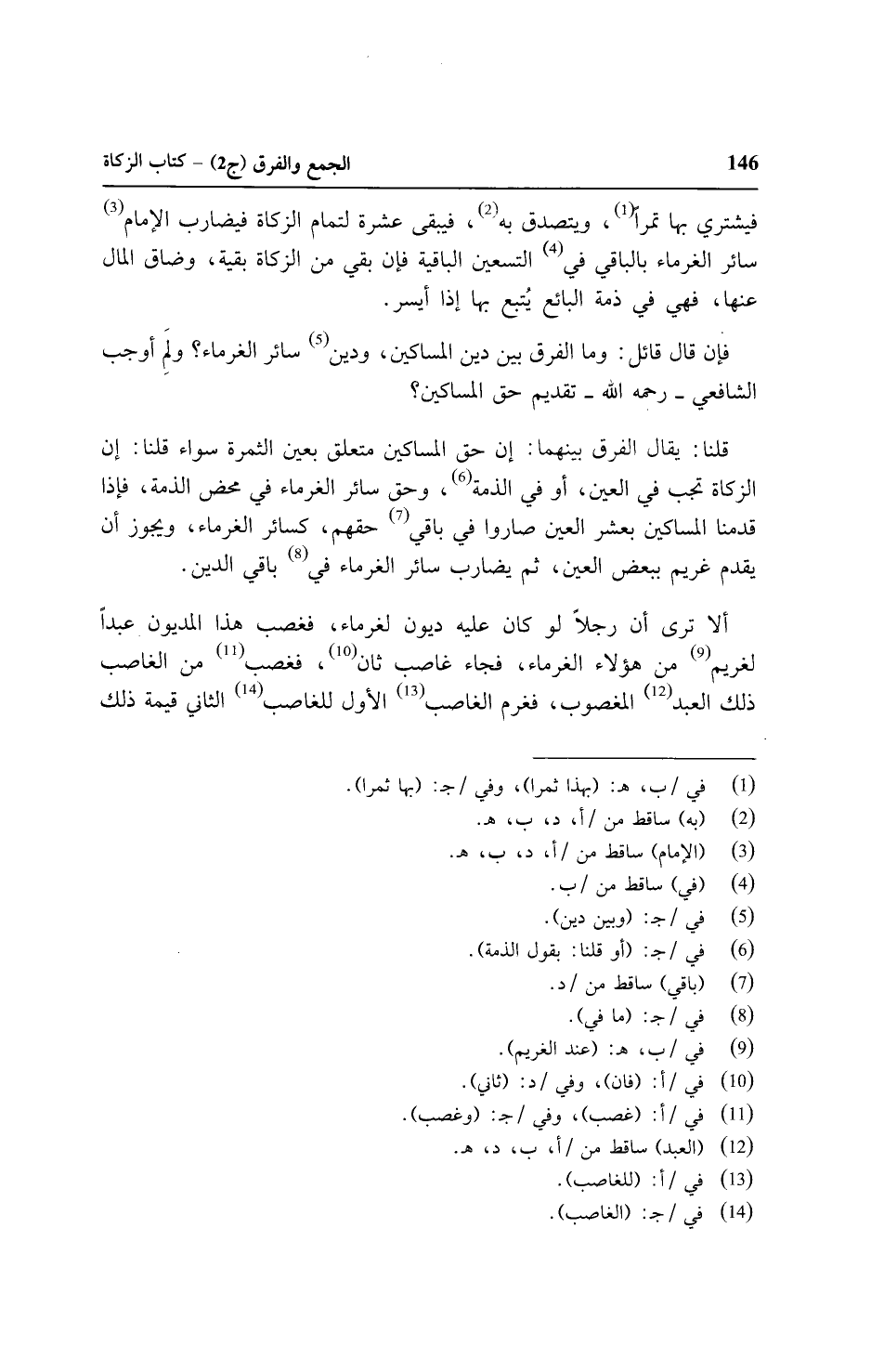 قلنا: يقال الفرق بينهما: إن حق المساكين متعلق بعين الثمرة سواء قلنا: إن الزكاة تجب في العين، أو في الذمة، وحق سائر الغرماء في محض الذمة، فإذا قدمنا المساكين بعشر العين صاروا في باقي حقهم، كسائر الغرماء، ويجوز أن يقدم غريم ببعض العين، ثم يضارب سائر الغرماء في باقي الدين.