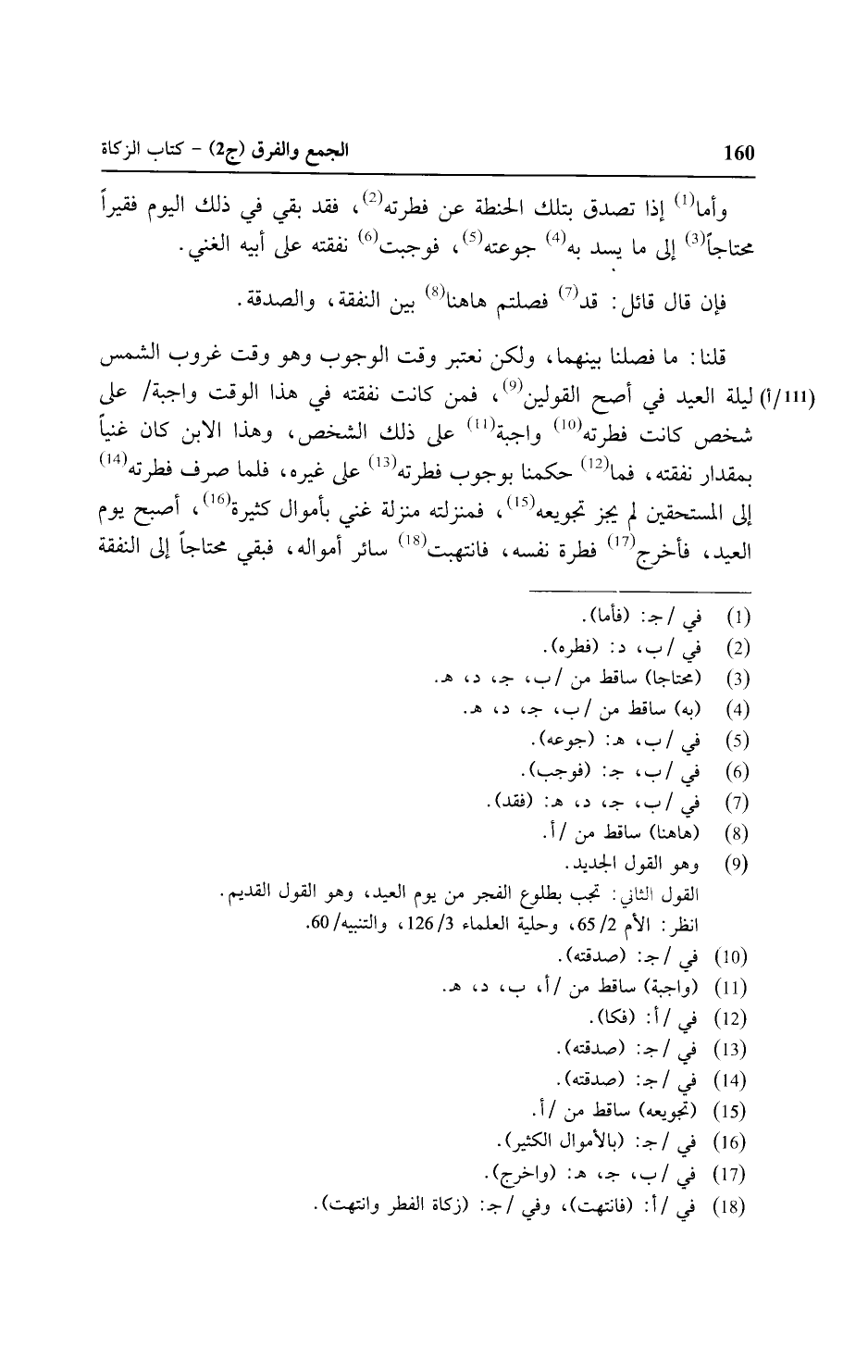 قلنا: ما فصلنا بينهما، ولكن نعتبر وقت الوجوب وهو وقت غروب الشمس ليلة العيد في أصح القولين، فمن كانت نفقته في هذا الوقت واجبة / (١١١/ أ) على شخص كانت فطرته واجبة على ذلك الشخص، وهذا الابن كان غنيًا بمقدار نفقته، فما حكمنا بوجوب فطرته على غيره، فلما صرف فطرته إلى المستحقين لم يجز تجويعه، فمنزلته منزلة غني بأموال كثيرة، أصبح يوم العيد، فأخرج فطرة نفسه، فانتهبت سائر أمواله، فبقي محتاجًا إلى النفقة
