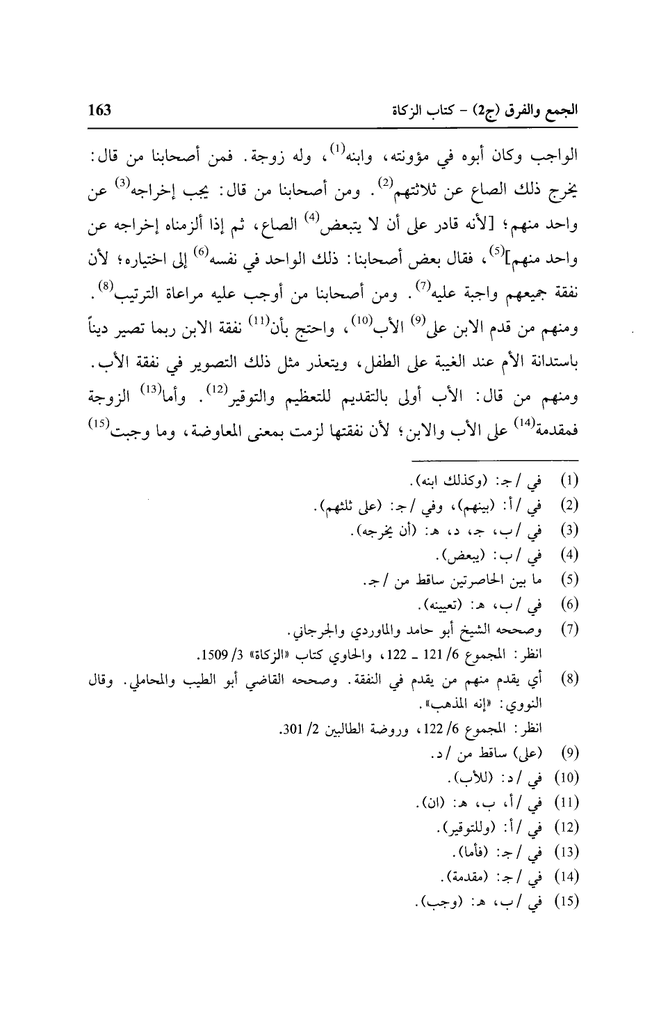 الواجب وكان أبوه في مؤونته، وابنه، وله زوجة. فمن أصحابنا من قال: يخرج ذلك الصاع عن ثلاثتهم. ومن أصحابنا من قال: بجب إخراجه عن واحد منهم؛ [لأنه قادر على أن لا يتبعض الصاع، ثم إذا ألزمناه إخراجه عن واحد منهم]، فقال بعض أصحابنا: ذلك الواحد في نفسه إلى اختياره؛ لأن نفقة جميعهم واجبة عليها. ومن أصحابنا من أوجب عليه مراعاة الترتيب. ومنهم من قدم الابن على الأب واحتج بأن نفقة الابن ربما تصير دينا باستدانة الأم عند الغيبة على الطفل، ويتعذر مثل ذلك التصوير في نفقة الأب. ومنهم من قال: الأب أولى بالتقديم للتعظيم والتوقير. وأما الزوجة فمقدمة على الأب والابن؛ لأن نفقتها لزمت بمعنى المعاوضة، وما وجبت