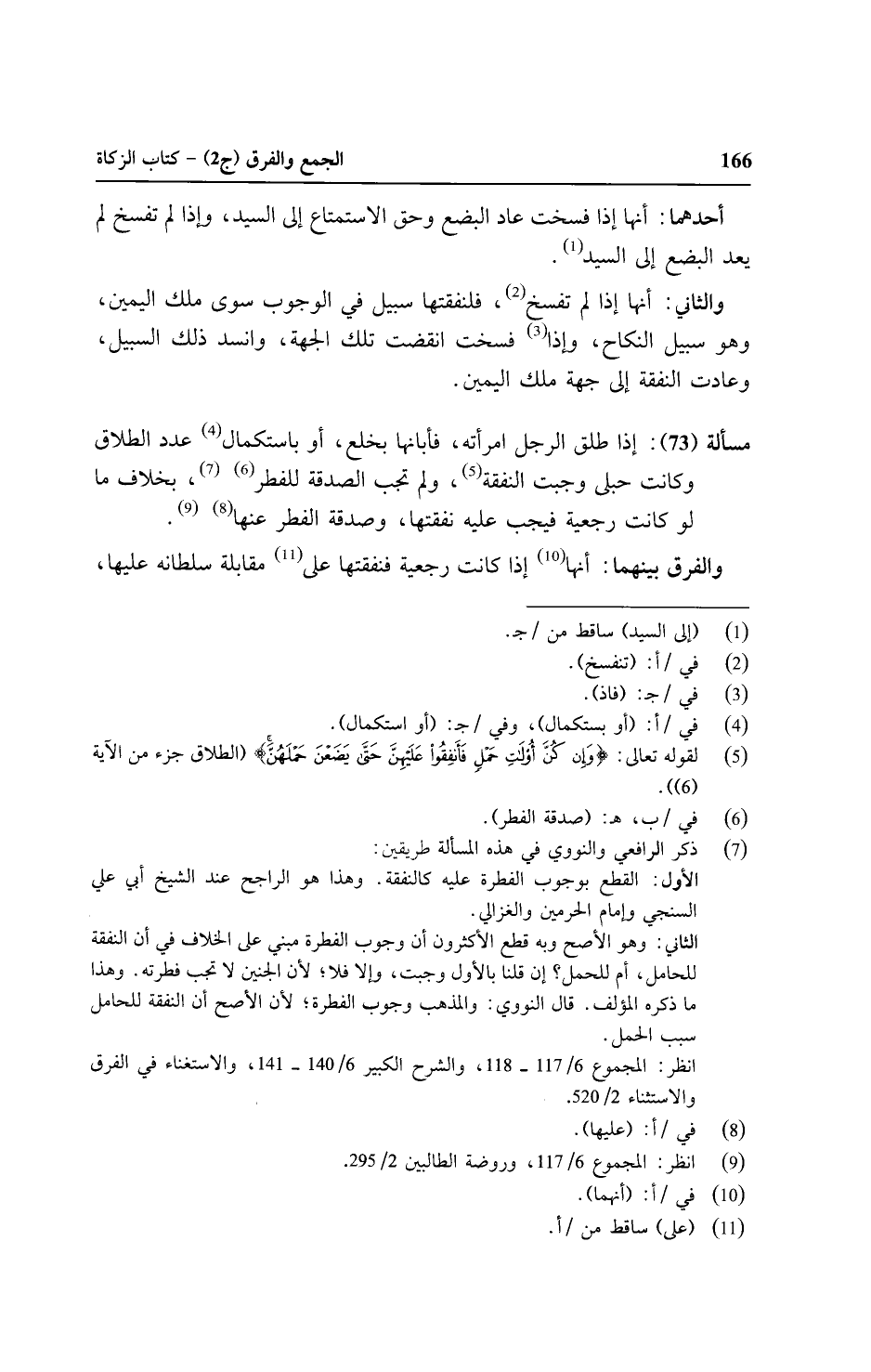 مسألة (٧٣): إذا طلق الرجل امرأته، فأبانها بخلع، أو باستكمال عدد الطلاق وكانت حبلى وجبت النفقة، ولم تجب الصدقة للفطر، بخلاف ما لو كانت رجعية فيجب عليه نفقتها، وصدقة الفطر عنها رد