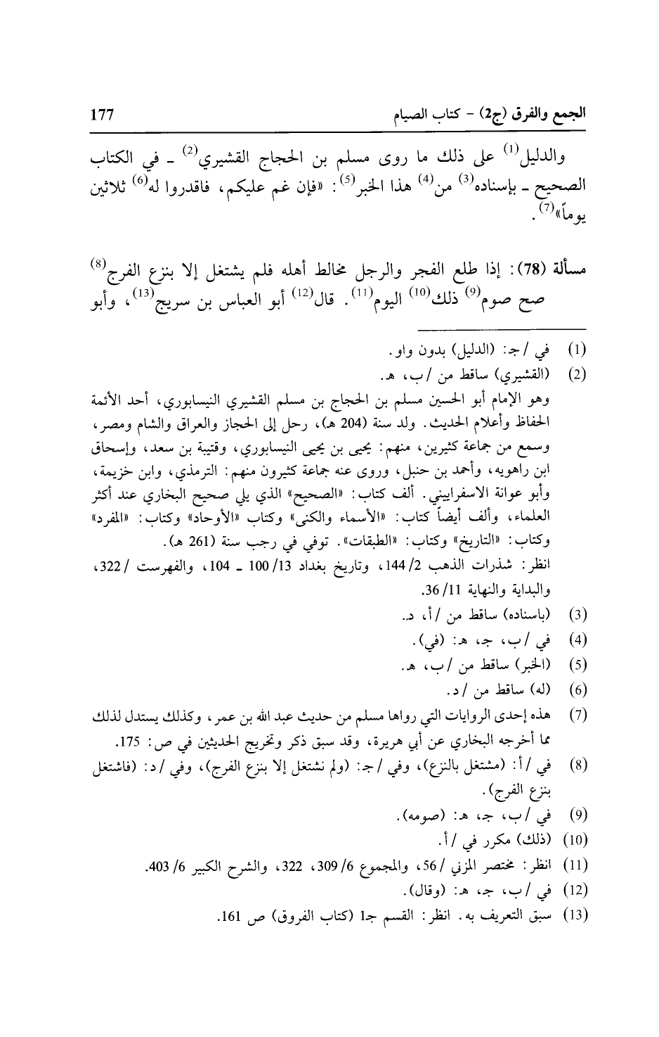 مسألة (٧٨): إذا طلع الفجر والرجل مخالط أهله فلم يشتغل إلا بنزع الفرج صح صوم ذلك اليوم قال: أبو العباس بن سريج، وأبو