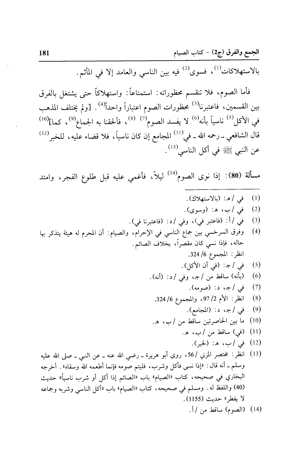 فأما الصوم، فلا تنقسم محظوراته: استمتاعاً واستهلاكًا حتى يشتغل بالفرق بين القسمين، فاعتبرنا، محظورات الصوم اعتبارًا واحدًا -[ولم يختلف المذهب في الأكل ناسيًا بأنه لا يفسد، فألحقنا به الجماع، كما] قال الشافعي - رحمه الله - في المجامع إن كان ناسيًا، فلا قضاء عليه، للخبر عن النبي - صلى الله عليه وسلم - في أكل الناسي.