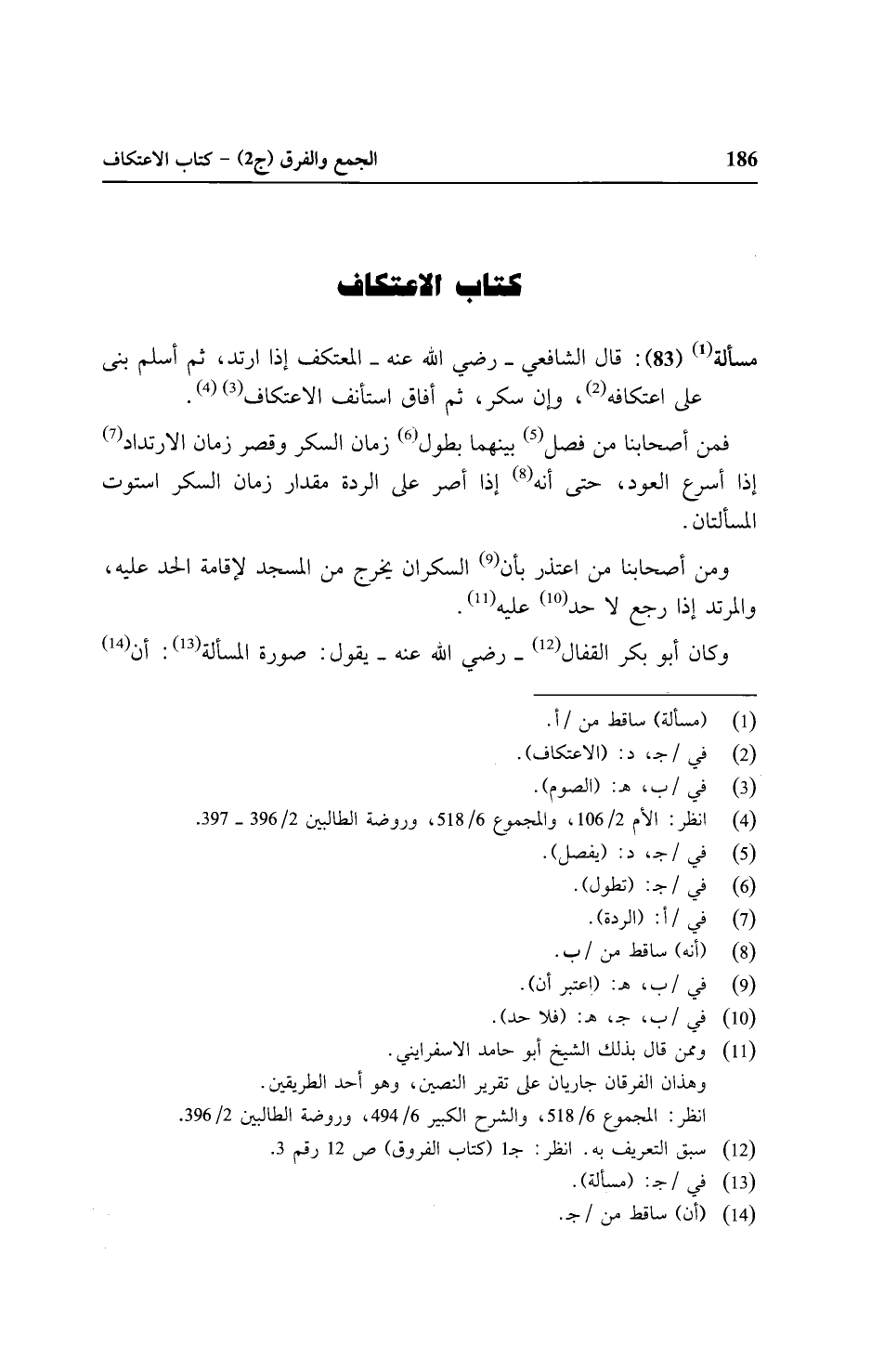 مسألة (٨٣): قال الشافعي - رضي الله عنه - المعتكف إذا ارتد، ثم أسلم بنى على اعتكافه، وإن سكر، ثم أفاق استأنف الاعتكاف.