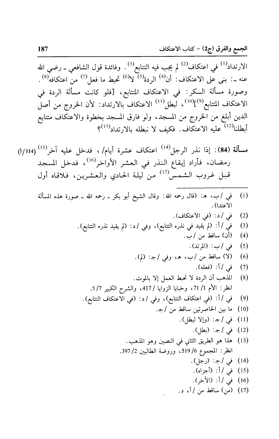 وصورة مسألة السكر: في الاعتكاف التتابع، [فلو كانت مسألة الردة في الاعتكاف المتتابع] لبطل الاعتكاف بالارتداد: لأن الخروج من أصل الدين أبلغ من الخروج من المسجد، ولو فارق المسجد بخطوة والاعتكاف متتابع أبطلنا عليه الاعتكاف. فكيف لا نبطله بالارتداد؟