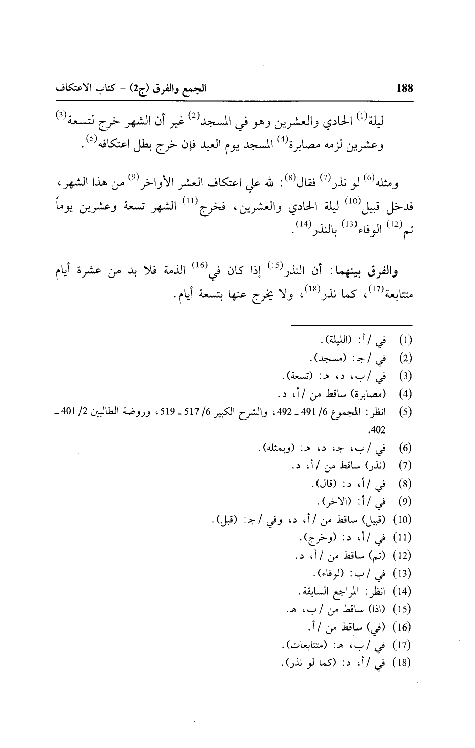 ومثله لو نذر فقال: لله علي اعتكاف العشر الأواخر من هذا الشهر، فدخل قبيل ليلة الحادي والعشرين، فخرج الشهر تسعة وعشرين يومًا تم رص الوفاء بالنذر.