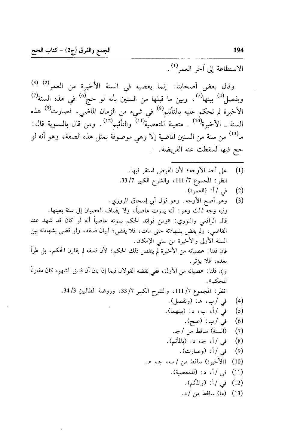 وقال بعض أصحابنا: إنما يعصيه في السنة الأخيرة من العمر ويفصل بينها، وبين ما قبلها من السنين بأنه لو حج في هذه السنة الأخيرة لم نحكم عليه بالتأثيم في شيء من الزمان الماضي، فصارت هذه السنة - الأخيرة - متعينة للتعصية والتأثيم. ومن قال بالتسوية قال: ما من سنة من السنين الماضية إلا وهي موصوفة بمثل هذه الصفة، وهو أنه لو حج فيها لسقطت عنه الفريضة.