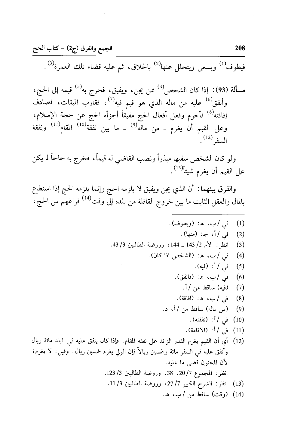 مسألة (٩٣): إذا كان الشخص ممن يجن، ويفيق، فخرج به قيمه إلى الحج، وأنفق عليه من ماله الذي هو قيم فيه، فقارب الميقات، فصادف إفاقته فأحرم وفعل أفعال الحج مفيقاً أجزأه الحج عن حجة الإسلام، وعلى القيم أن يغرم - من ماله - ما بين نفقة المقام ونفقة السفر.