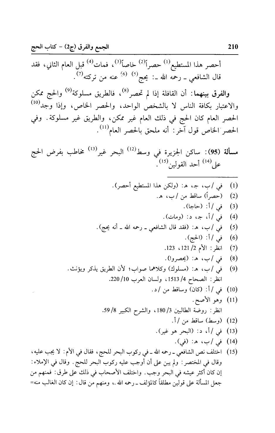 والفرق بينهما: أن القافلة إذا لم تحصر، فالطريق مسلوكة والحج ممكن والاعتبار بكافة الناس لا بالشخص الواحد، والحصر الخاص، وإذا وجد الحصر العام كان الحج في ذلك العام غير ممكن، والطريق غير مسلوكة. وفي الحصر الخاص قول آخر: أنه ملحق بالحصر العام.