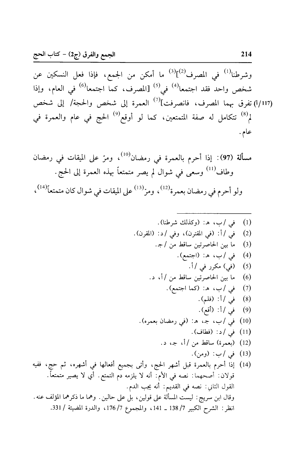 وشرطنا في المصرف] ما أمكن من الجمع, فإذا فعل النسكين عن شخص واحد فقد اجتمعا في [المصرف, كما اجتمعا في العام, وإذا (١١٧/أ) تفرق بها المصرف, فانصرفت] العمرة إلى شخص والحجة / إلى شخص لم تتكامل له صفة المتمتعين, كما لو أوقع الحج في عام والعمرة في عام.