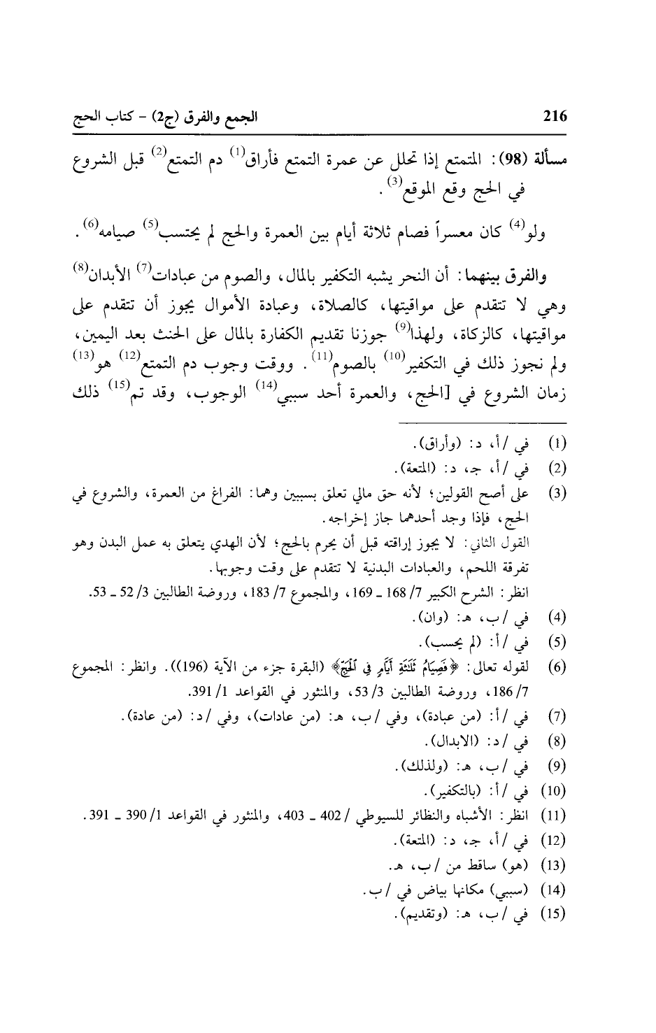 والفرق بينهما: أن النحر يشبه التكفير بالمال, والصوم من عبادات الأبدان وهي لا تتقدم على مواقيتها, كالصلاة, وعبادة الأموال يجوز أن تتقدم على مواقيتها, كالزكاة, ولهذا جوزنا تقديم الكفارة بالمال على الحنث بعد اليمين, ولم نجوز في التكفير بالصوم. ووقت وجوب دم التمتع هو زمان الشروع في [الحج, والعمرة أحد سببي الوجوب, وقد تم ذلك