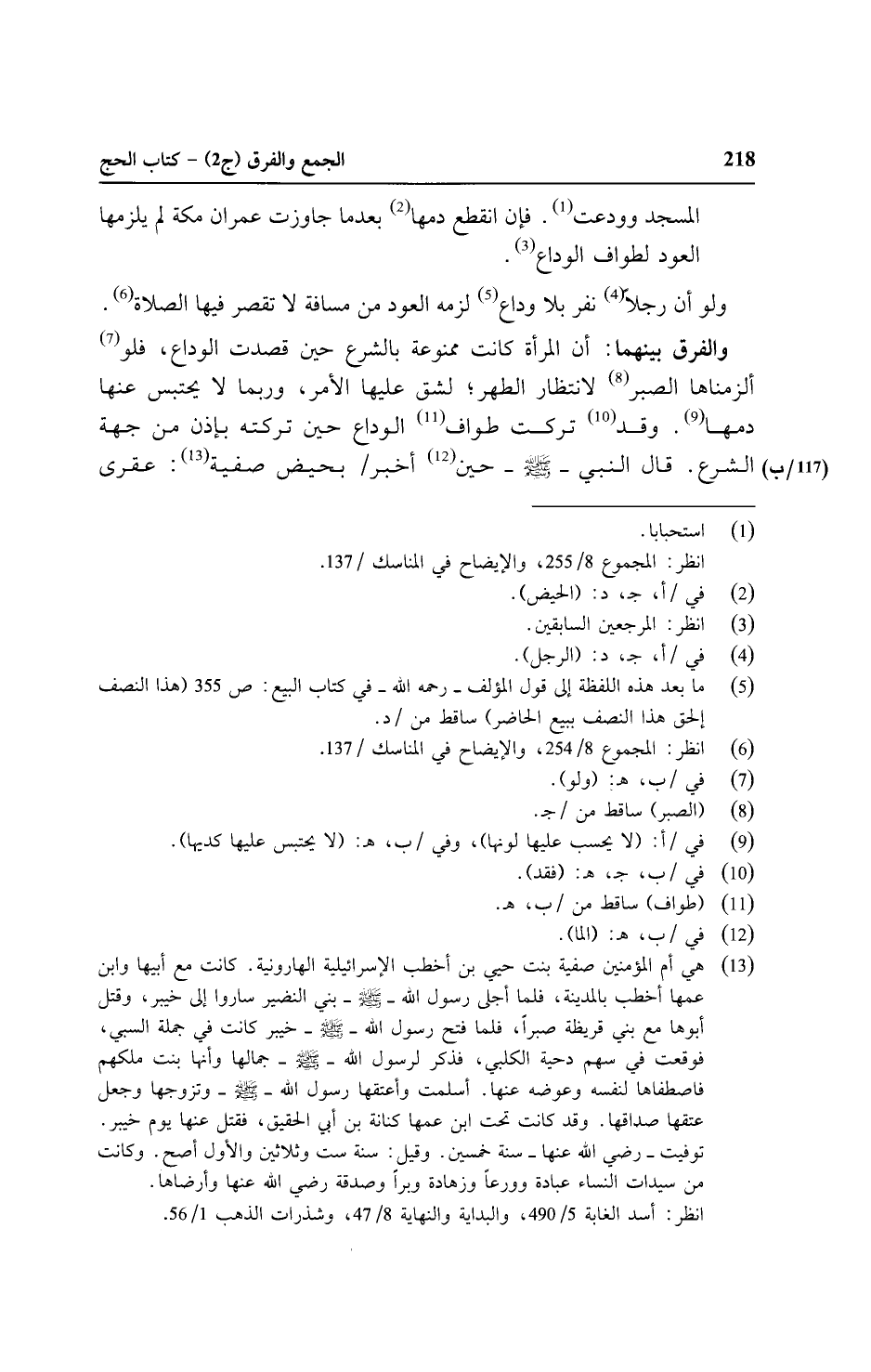 ولو أن رجلاً نفر بلا وداع لزمه العود من مسافة لا تقصر فيها الصلاة. والفقر بينهما: أن المرأة كانت ممنوعة بالشرع حين قصدت الوادع, فلو ألزمناها الصبر لانتظار الطهر لشق عليها الأمر, وربما لا يحتبس عنها دمها. وقد تركت طواف الوداع حين تركته بإذن من جهة الشرع. قال النبي - صلى الله عليه وسلم - حين أخبر/ (١١٧/ب) بحيض صفية: عقري