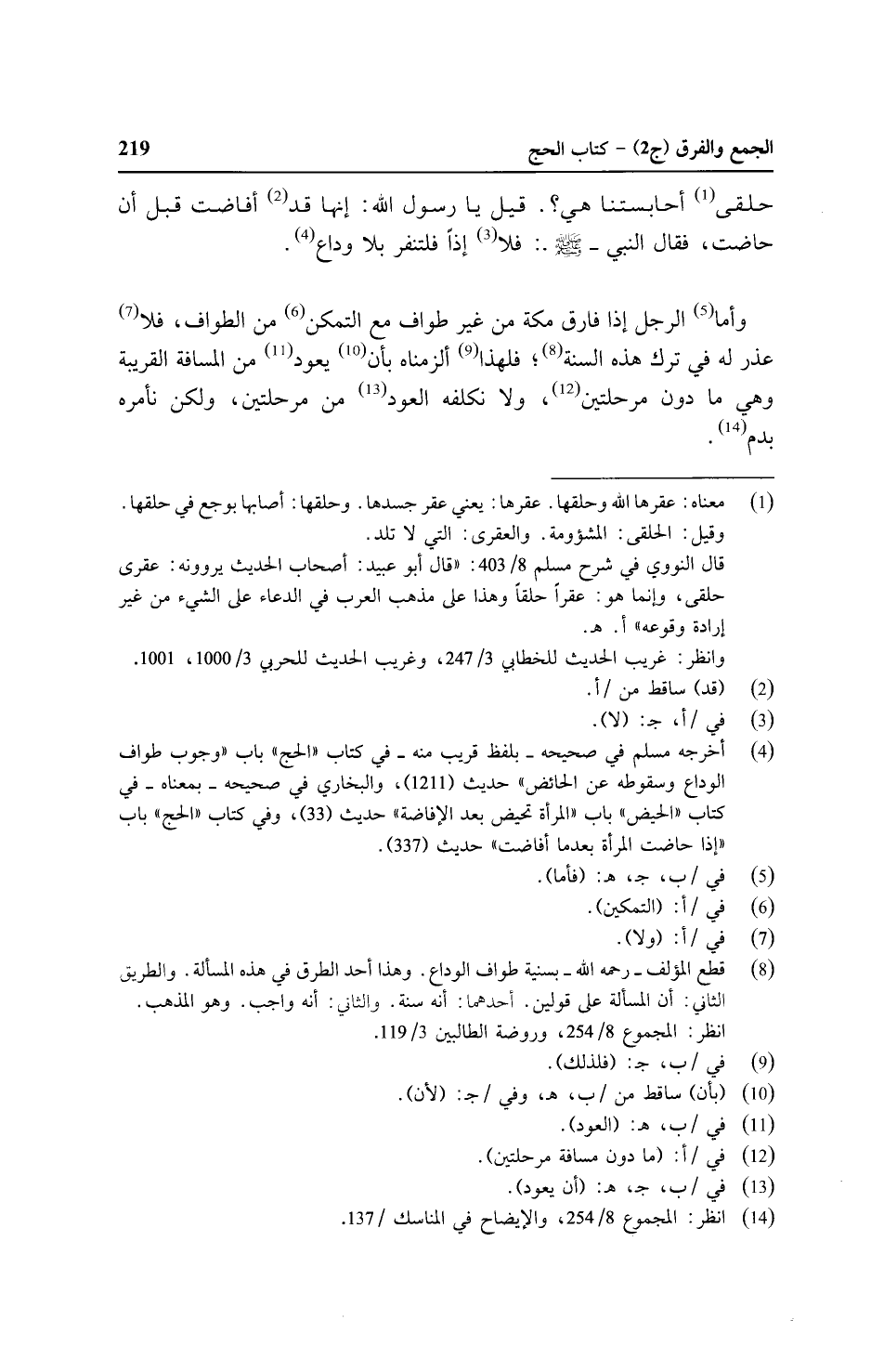 حلقي أحابستنا هي؟. قيل يا رسول الله: إنها قد أفاضت قبل أن حاضت, فقال النبي - صلى الله عليه وسلم -: فلا إذًا فتنفر بلا وداع.
