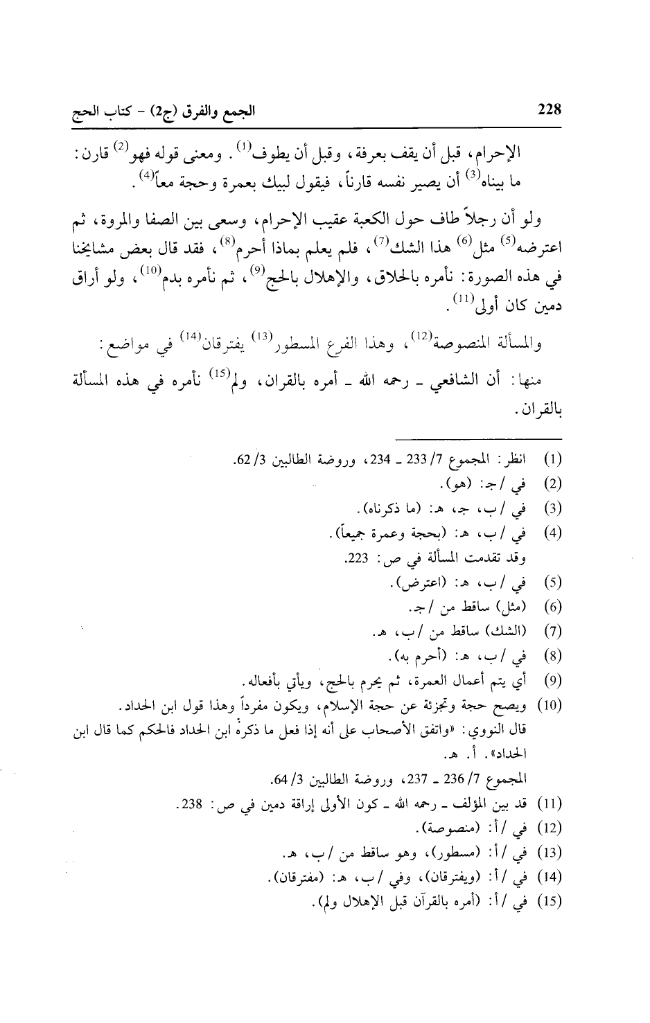 الإحرام, قبل أن يقف بعرفة, وقبل أن يطوف. ومعنى قوله فهو قارن: ما بيناه أن يصير نفسه قارنًا, فيقول لبيك بعمرة وحجة معًا.