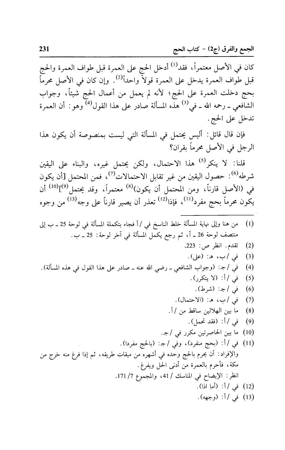 قلنا: لا ينكر هذا الاحتمال, ولكن يحتمل غيره, والبناء على اليقين شرطه: حصول اليقين من غير تقابل الاحتمالات, فمن المحتمل [أن يكون في (الأصل قارنًا, ومن المحتمل أن يكون) معتمرًا, وقد يحتمل] أن يكون محرمًا بحج مفرد, فإذا تعذر أن يصير قارنًا على وجه من وجوه