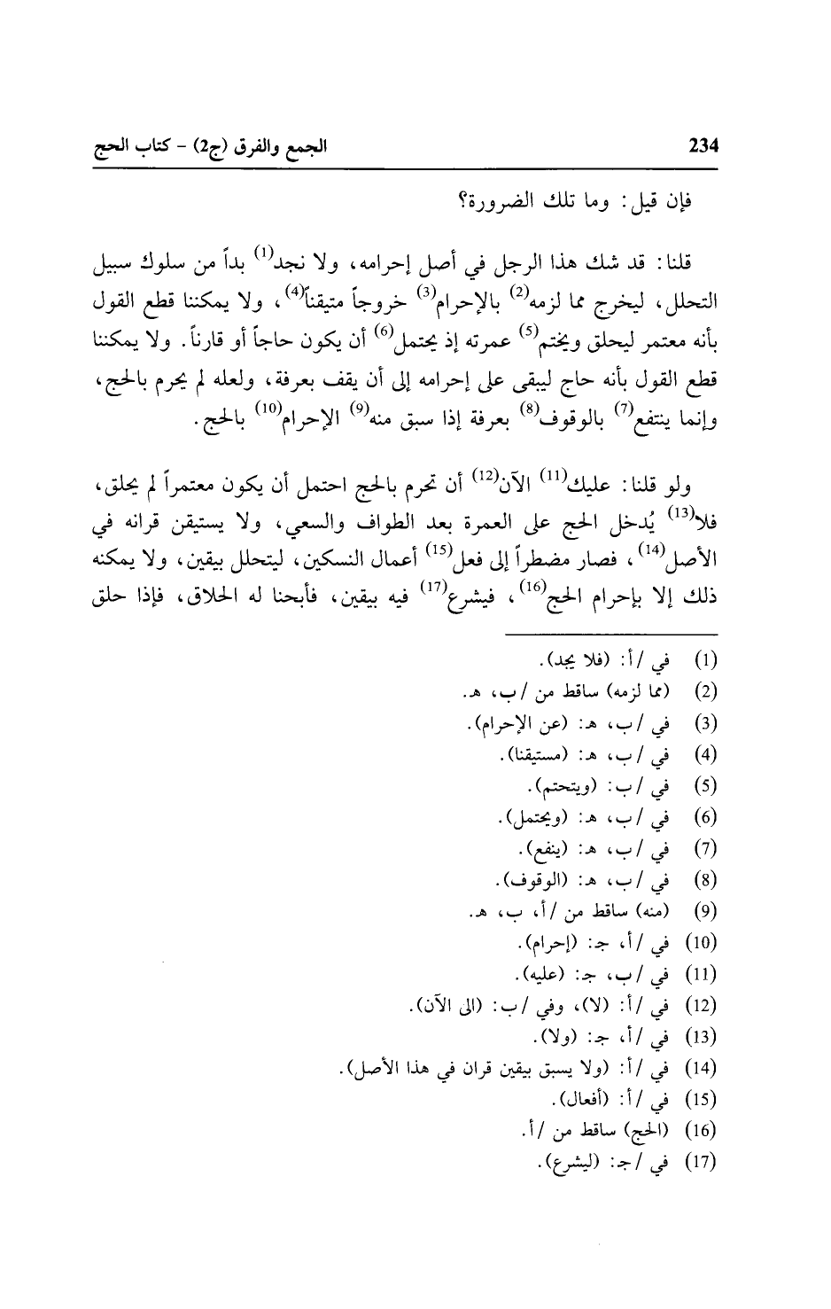 قلنا: قد شك هذا الرجل في أصل إحرامه, ولا نجد بدًا من سلوك سبيل التحلل, ليخرج مما لزمه بالإحرام خروجًا متيقنًا, ولا يمكننا قطع القول بأنه معتمر ليلحق ويختم عمرته إذا يحتمل أن يكون حاجًا أو قارنًا. ولا يمكننا قطع القول بأنه حاج ليبقى على إحرامه إلى أن يقف بعرفة, ولعله لم يحرم بالحج, وإنما ينتفع بالوقوف بعرفة إذا سبق منه الإحرام بالحج.