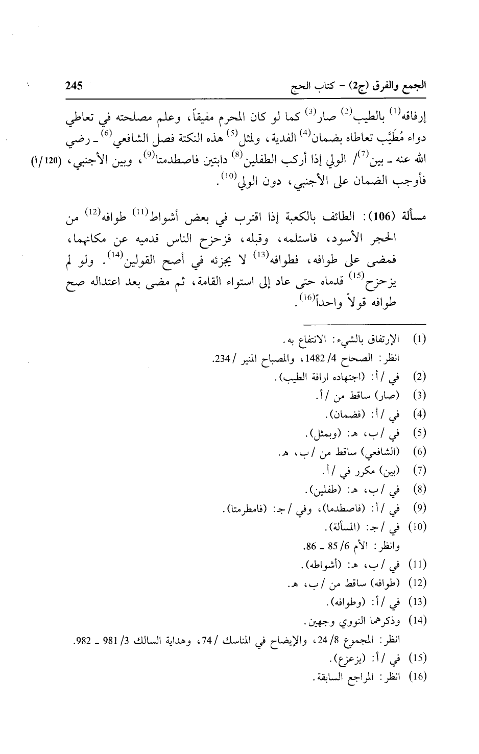 مسألة (١٠٦): الطائف إذا اقترب في بعض أشواط طوافه من الحجر الأسود، فاستلمه، وقبله، فزحزح الناس قدميه عن مكانهما، فمضي علي طوافه، فطوافه لا يجزئه في أصح القولين. ولو لم يزحزح قدماه حتى عاد إلي استواء القامة، ثم مضي بعد اعتداله صح طوافه قولاً واحداً.