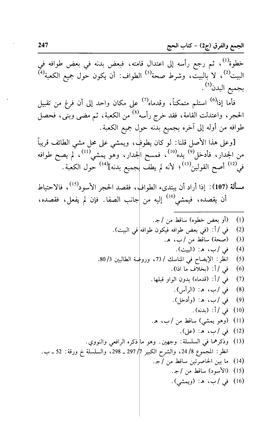 مسألة (١٠٧): إذا أراد أن يبتدئ الطواف، فقصد الحجر الأسود، فالاحتياط أن يقصده، فيمشي إليه من جانب الصفا. فإن لم يفعل، فقصده،