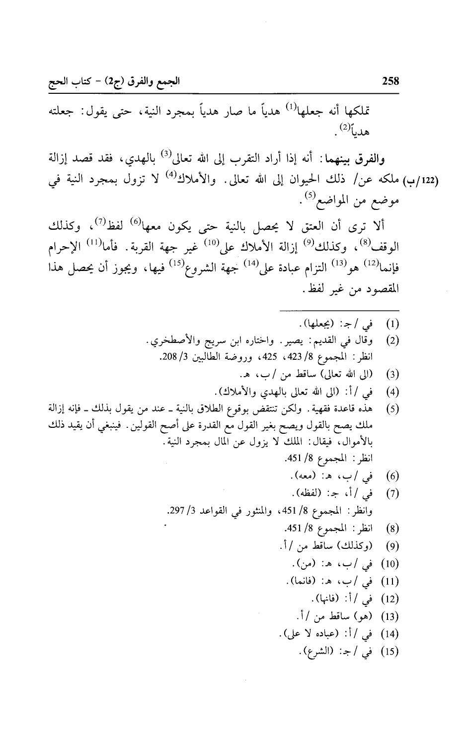 والفرق بينهما: أنه إذا أراد التقرب إلى الله تعالى بالهدي، فقد قصد إزالة ملكه عن/ (١٢٢/ب) ذلك الحيوان إلى الله تعالى. والأملاك لا تزول بمجرد النية في موضع من المواضع.