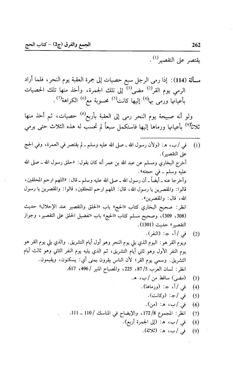 مسألة (١١٤): إذا رمى الرجل سبع حصيات إلى جمرة العقبة يوم النحر، فلما أراد الرمي يوم القر مضى إلى تلك الجمرة، وأخذ منها تلك الحصيات بأعيانها ورمى إليها كانت محسوبة مع الكراهة.