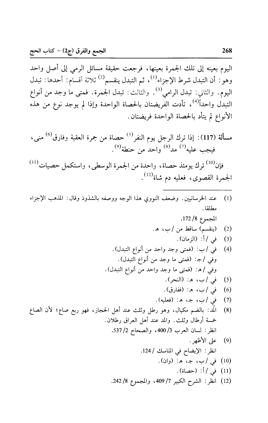 مسألة (١١٧): إذا ترك الرجل يوم النفر حصاة من جمرة العقبة وفارق منى، فيجب عليه مد واحد من حنطة.