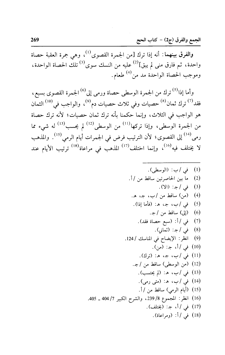 والفرق بينهما: أنه إذا ترك امن الجمرة القصوى، وهي جمرة العقبة حصاة واحدة، ثم فارق منى لم يبق] عليه من النسك سوى تلك الحصاة الواحدة، وموجب الحصاة الواحدة مد من طعام.