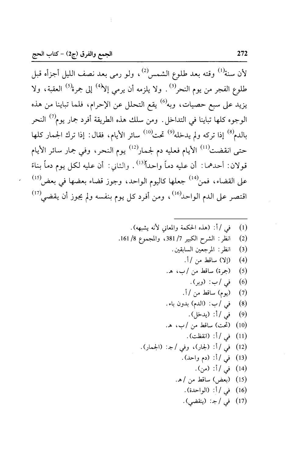 لأن سنة وقته بعد طلوع الشمس، ولو رمى بعد نصف الليل أجزأه قبل طلوع الفجر من يوم النحر. ولا يلزمه أن يرمي إلا إلى جمرة العقبة، ولا يزيد على سبع حصيات، وبه يقع التحلل عن الإحرام، فلما تباينا من هذه الوجوه كلها تباينا في التداخل. ومن سلك هذه الطريقة أفرد جمار يوم النحر الدم إذا تركه ولم يدخله تحت سائر الأيام، فقال: إذا ترك الجمار كلها حتى انقضت الأيام فعليه دم لجمار يوم النحر، وفي جمار سائر الأيام قولان: أحدهما أن عليه دمًا واحدًا. والثاني: أن عليه لكل يوم دمًا بناء على القضاء، فمن جعلها كاليوم الواحد، وجوز قضاء بعضها في بعض اقتصر على الدم الواحد، ومن أفرد كل يوم بنفسه ولم يجوز أن يقضي